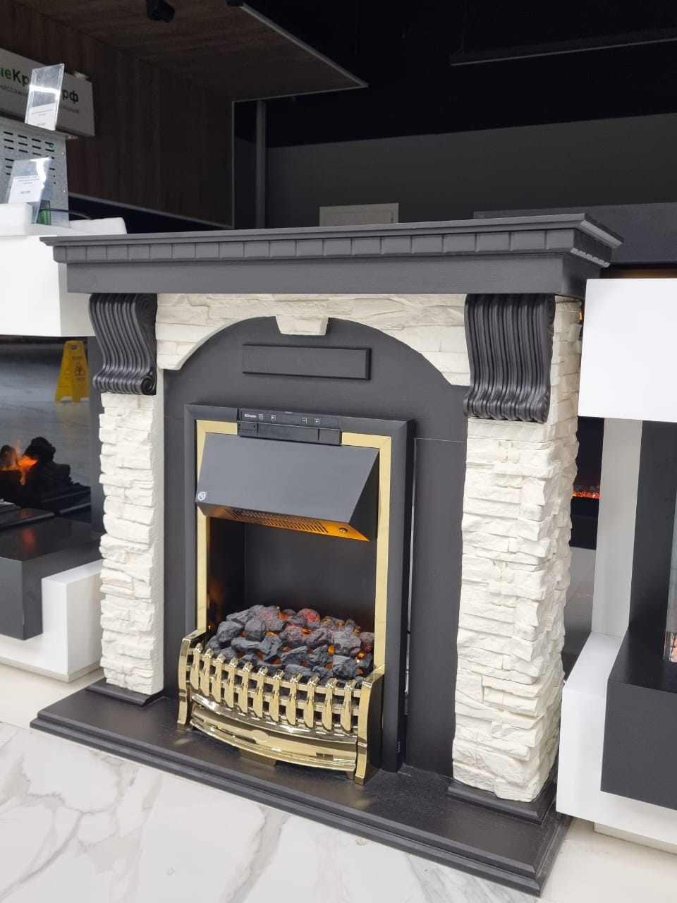 Вместо классических поленьев в очаге используется имитация  тлеющих углей.